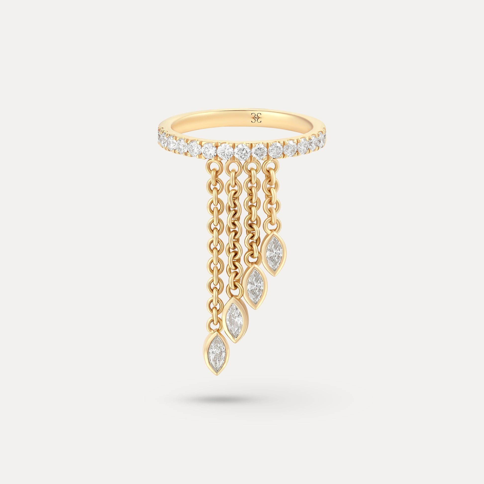The Diamond Waterfall Band features a delicate pavé 18K gold band set with shimmering round diamonds, cascading into four fluid gold chains finished with marquise-shaped diamond drops. Each detail is crafted to create a soft, graceful motion with every gesture.