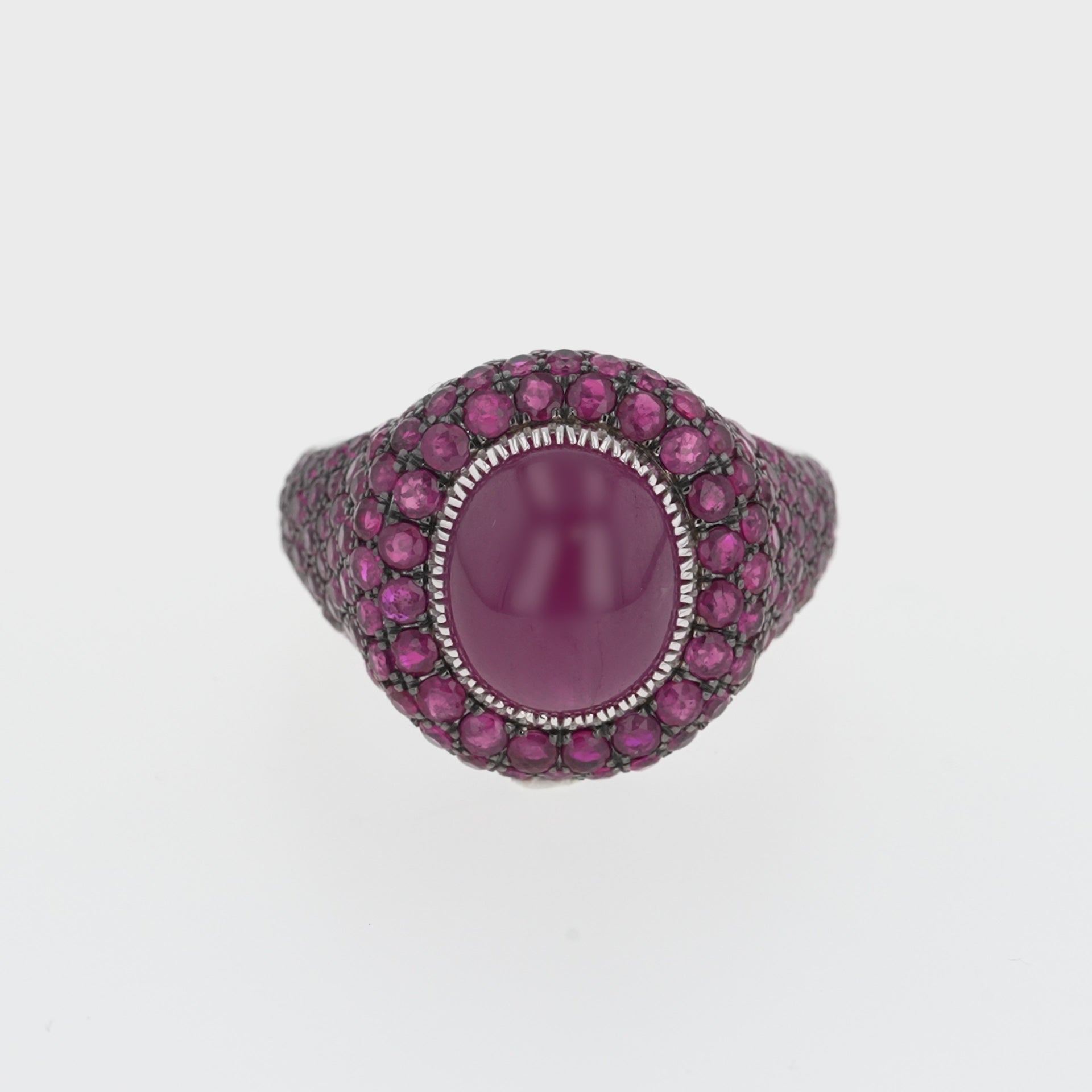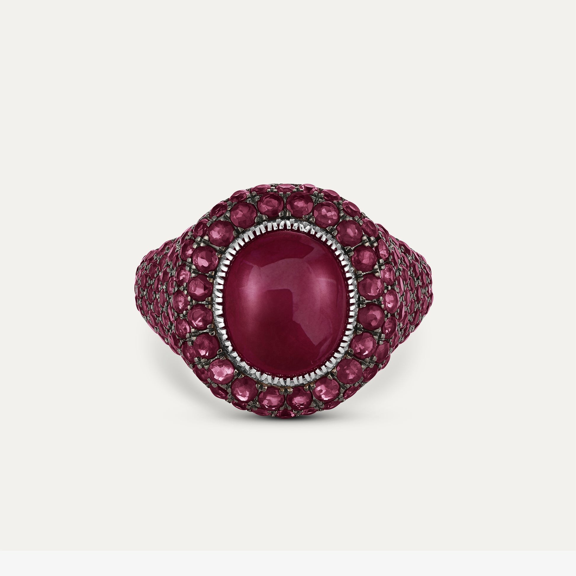 At its center sits a striking oval 6.7 ct ruby cabochon, set in a unique Ottoman inspired style setting & framed by rows of 160 hand-set rubies totaling 3.60ct. The surrounding stones are set in black rhodium, creating depth and contrast that amplifies the intensity of the central gem.