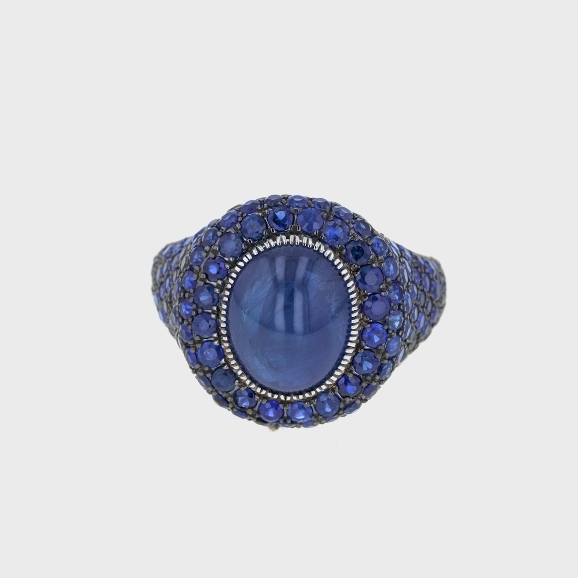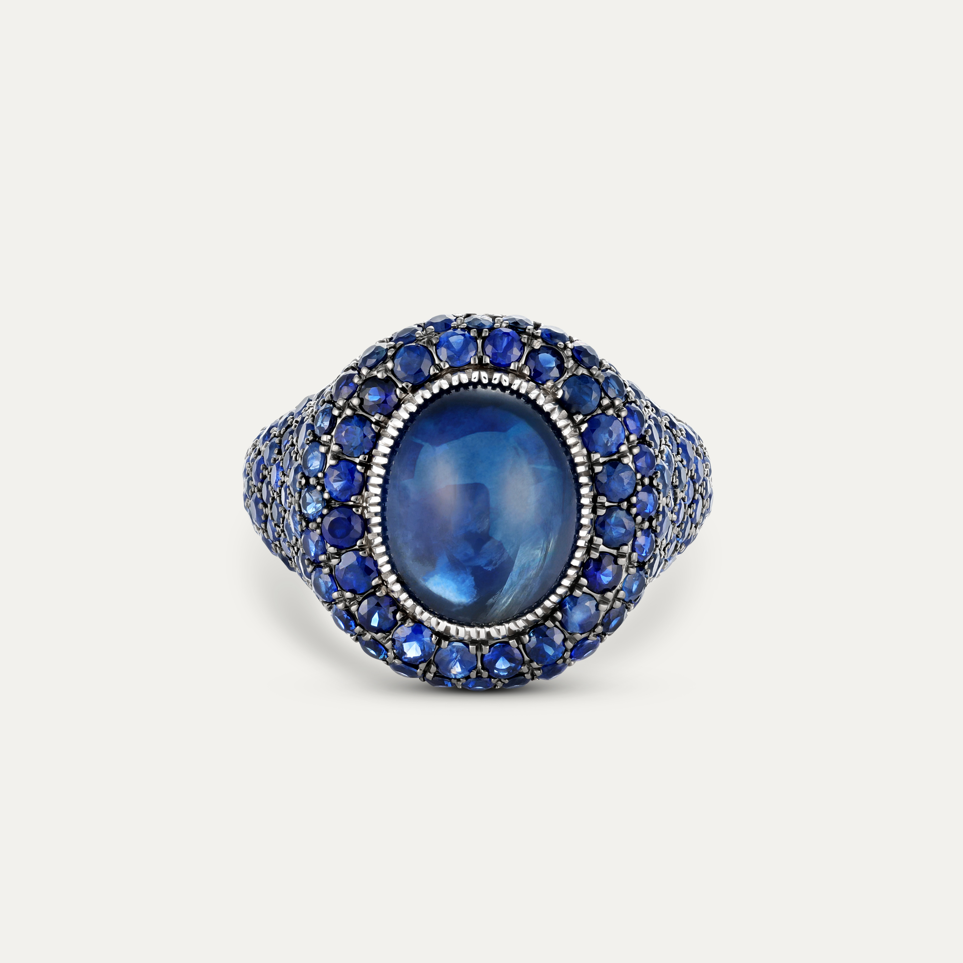 At its center sits a striking oval 6 ct sapphire cabochon, set in a unique Ottoman inspired style setting & framed by rows of 160 hand-set sapphires totaling 3.60ct. The surrounding stones are set in black rhodium, creating depth and contrast that amplifies the intensity of the central gem.
