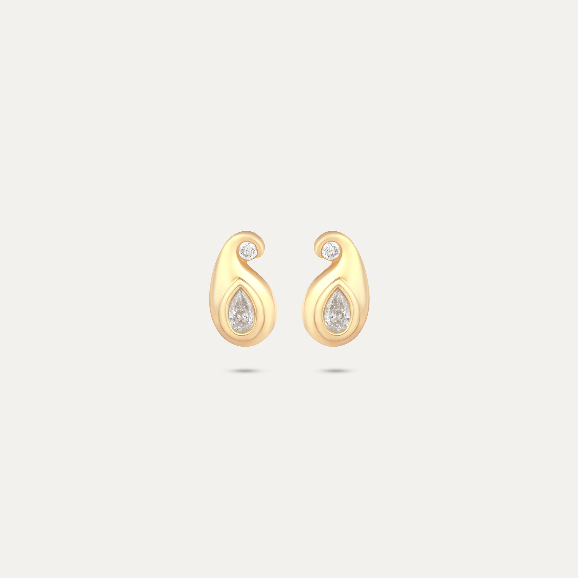 A modern interpretation of a timeless motif, each earring features a sculpted paisley silhouette crafted in 18K gold, accented with two natural diamonds — a pear-shaped stone nestled at the base and a round diamond set delicately at the curve.